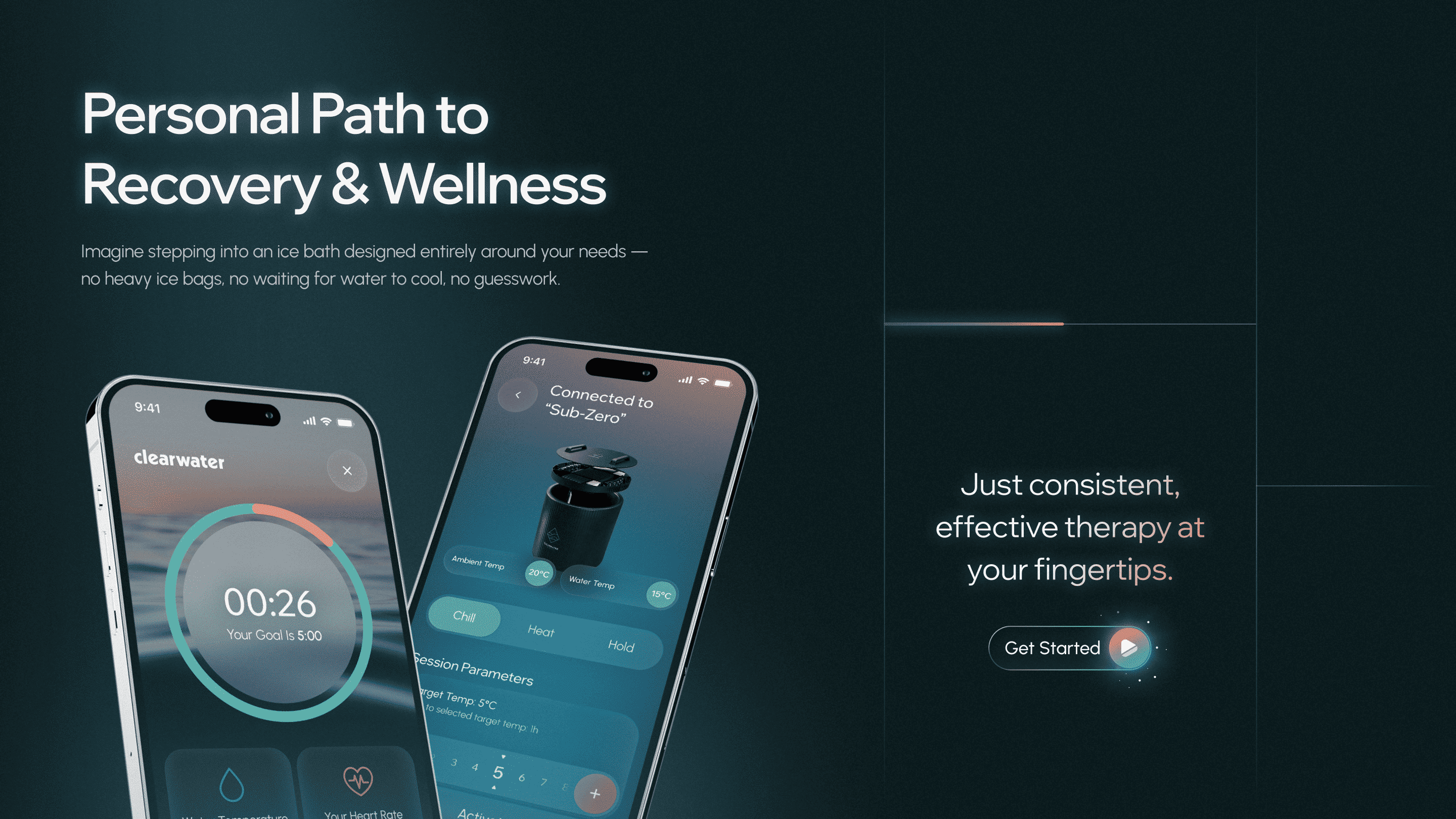 The Project. Clearwater Wellness Co. developed a smart plunge platform that connects physical hardware with a structured digital experience for cold therapy. The project covered end-to-end UX, including mode control (chill, cold, heat), alarms, session analytics, and group sharing.