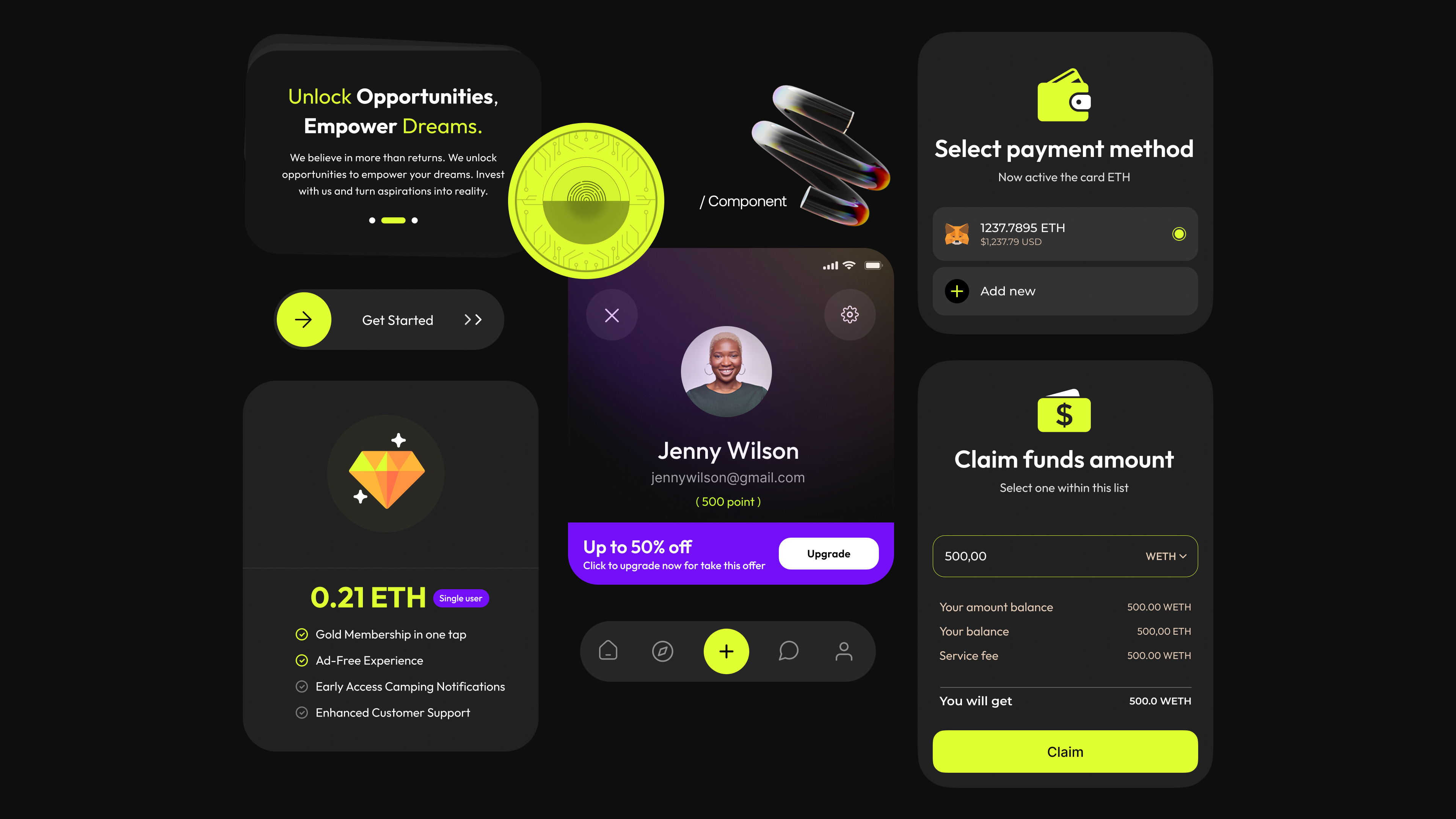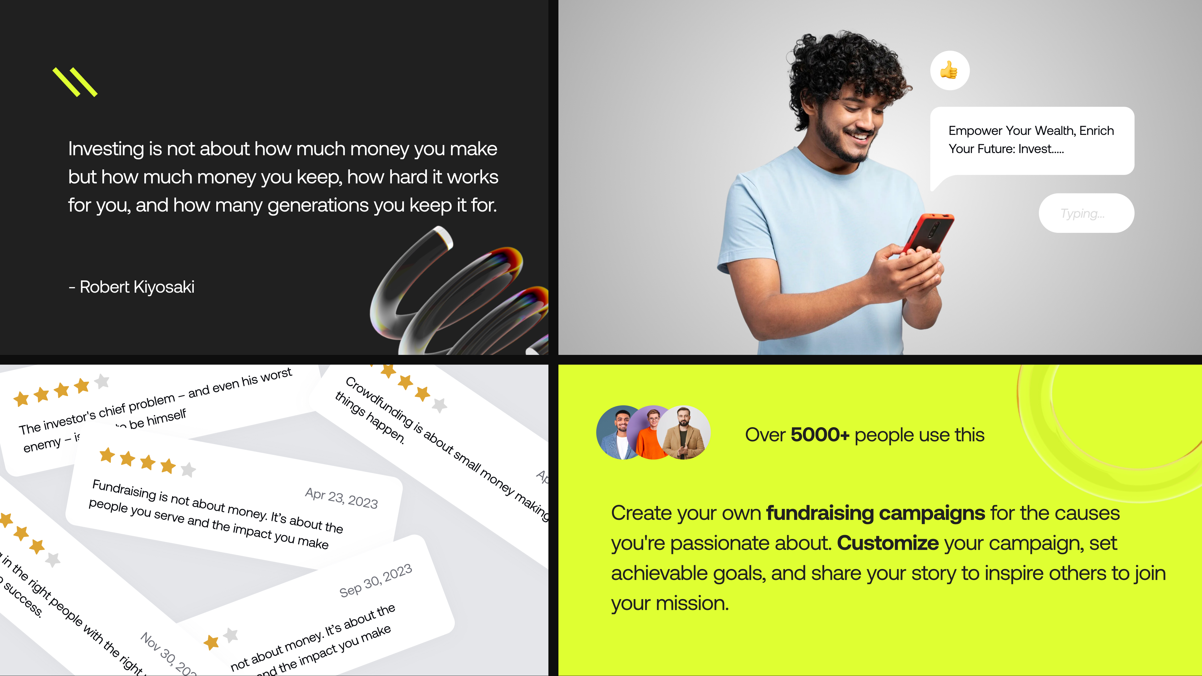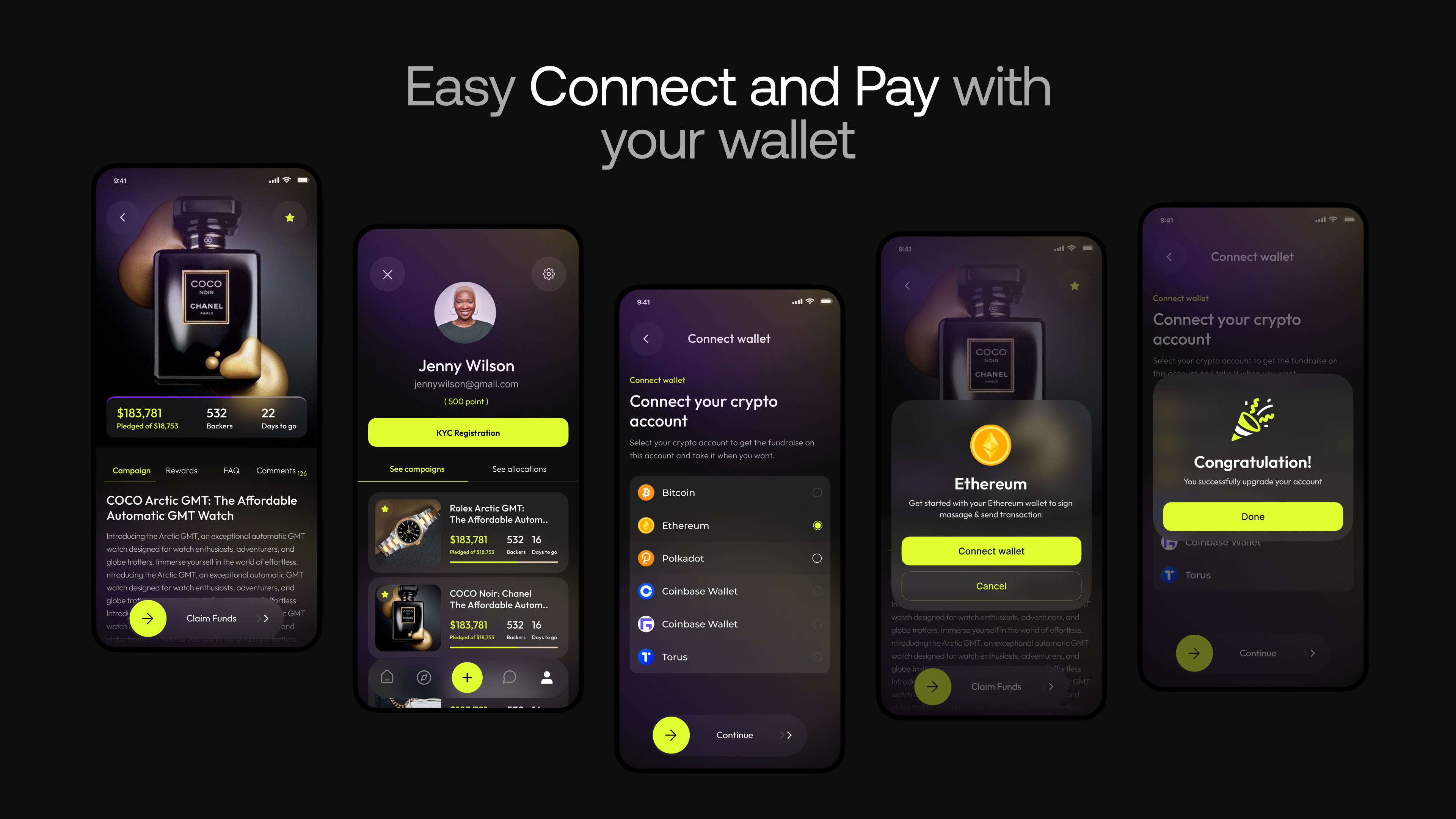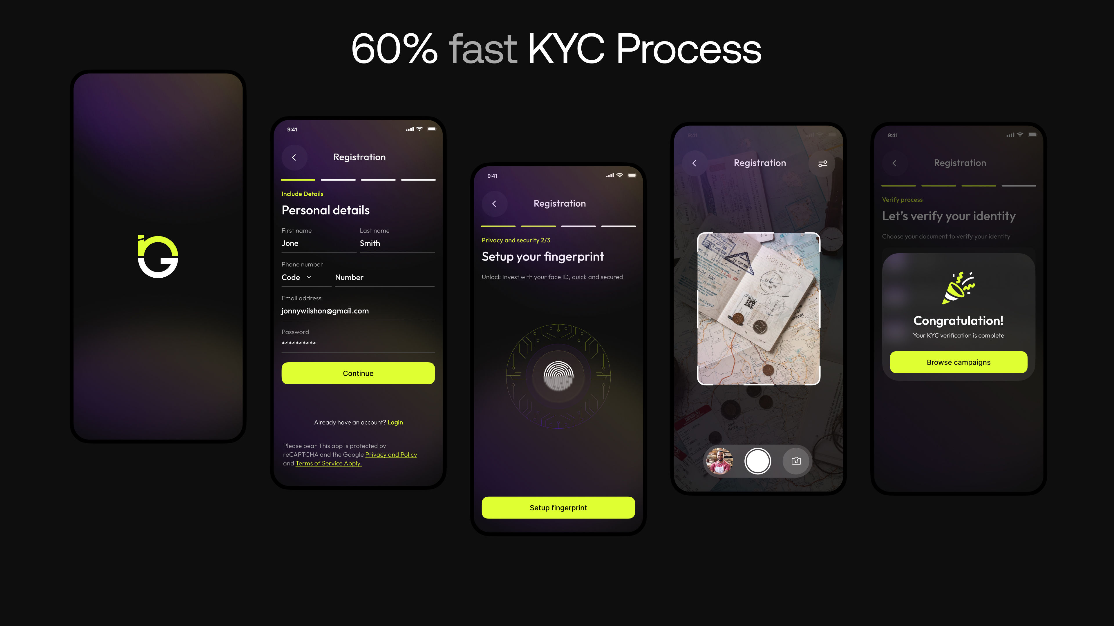 The experience is intentionally modeled on premium financial products. The interface is clean and composed, built around a dark-mode environment that keeps attention on campaign stories and funding progress. Key signals — progress, backer count, time remaining — are visible at a glance. Multi-step actions, such as identity verification, are clearly structured with progress indicators that reduce uncertainty. After a donation is completed, subtle celebratory motion acknowledges the action without breaking focus.